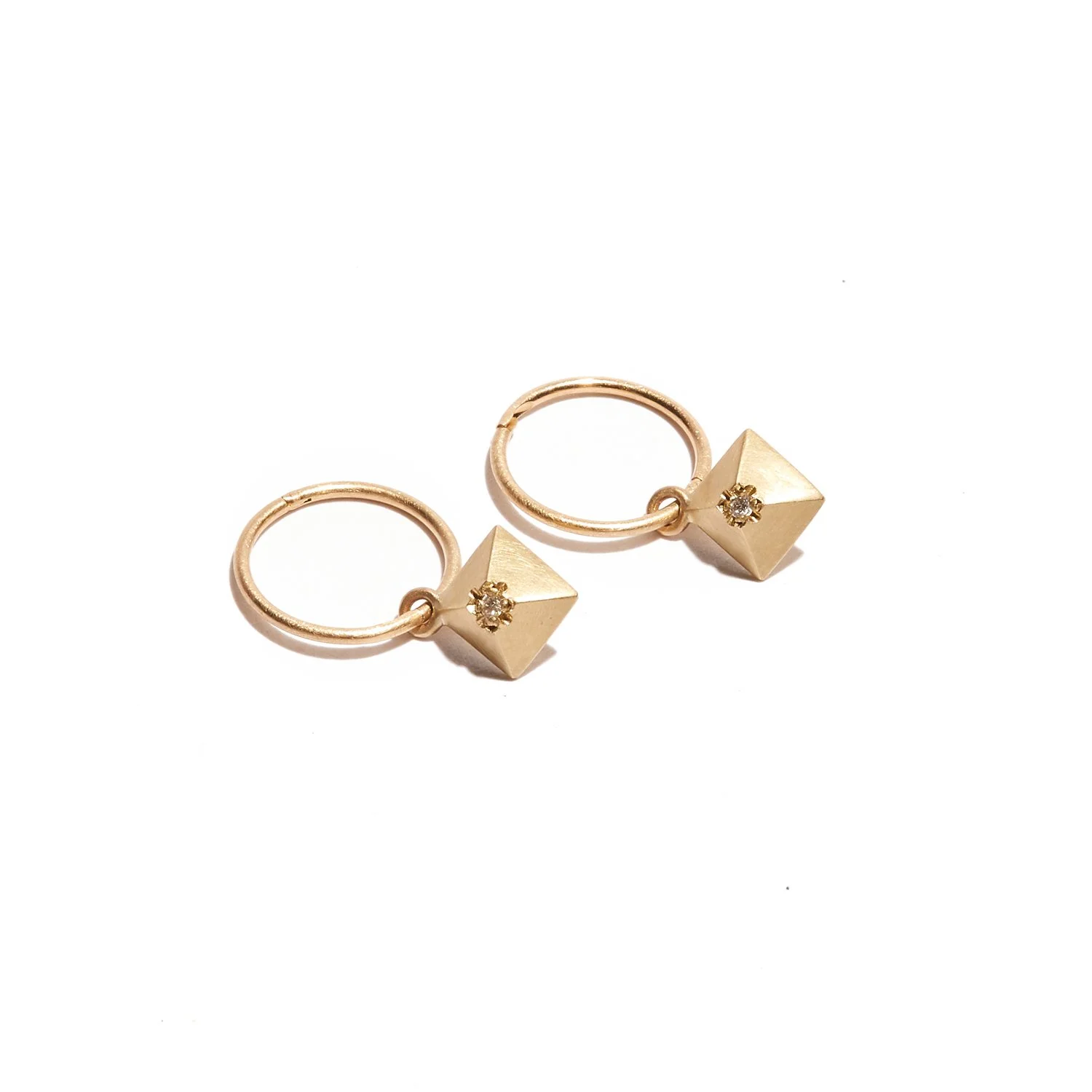 An effortless, wearable diamond earring alternative, so comfortable you can even sleep in them. Each pyramid charm features a natural, brilliant-cut white diamond, set in a cross-cut, grain technique for a refined, timeless look. Hinged solid gold sleeper hoops. Sold as singles.