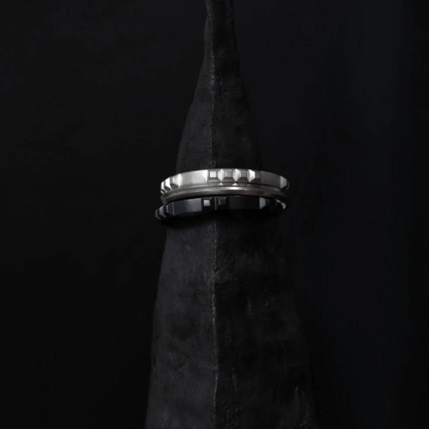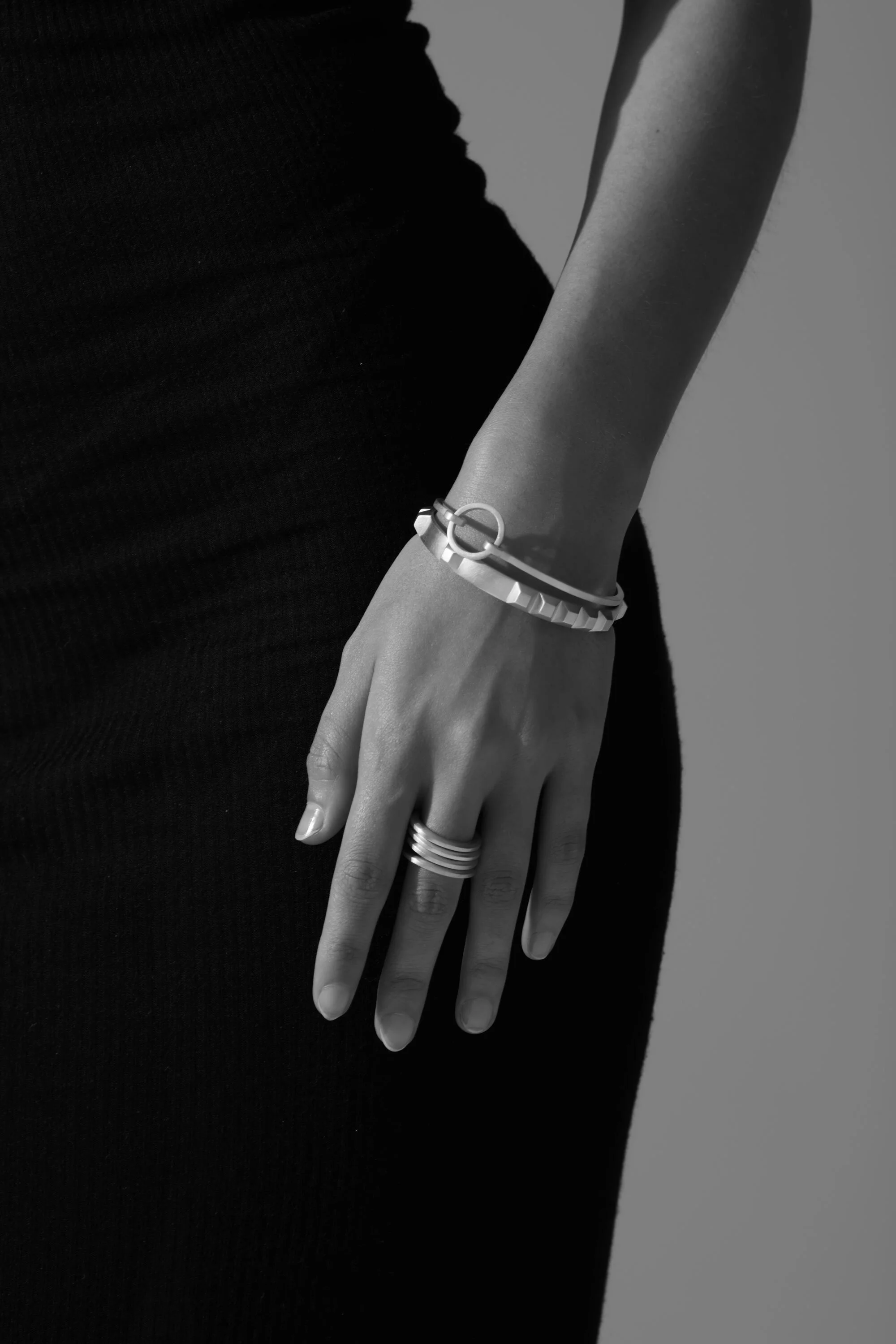 Solid sterling silver Enigma Bangle features 10 cropped pyramids, spaced in natural numerical groups. Worn with Half Circle Bracelet and Profile Stack Ring (sold separately).