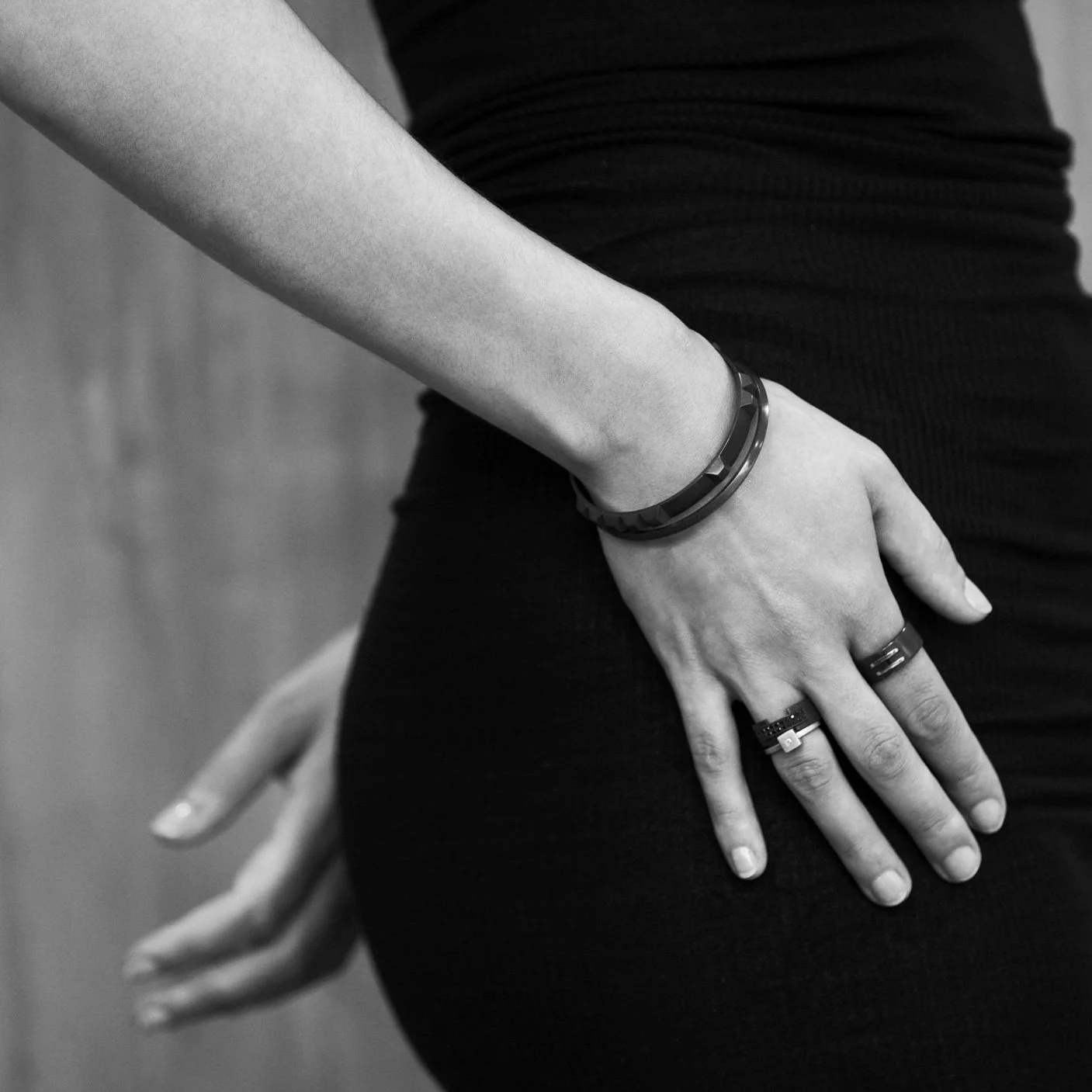 Solid sterling silver Enigma Bangle features 10 cropped pyramids, spaced in natural numerical groups. Worn with Half Circle Bracelet & Profile Stack Ring (sold separately).