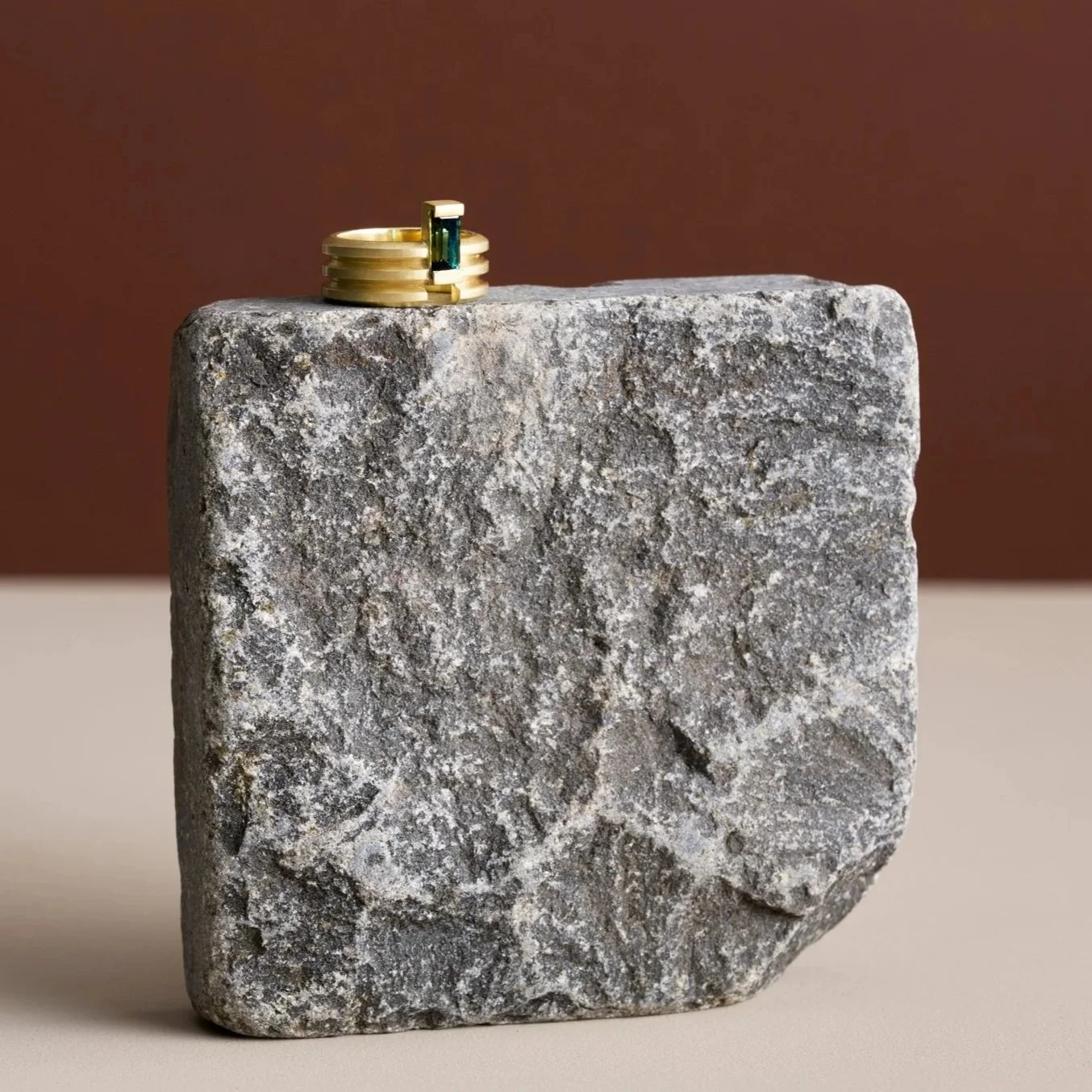 A bold gold ring defined by rhythmic, angled detailing and featuring a baguette-cut Australian green parti sapphire - set just off the edge, as if gently sliding through the band.