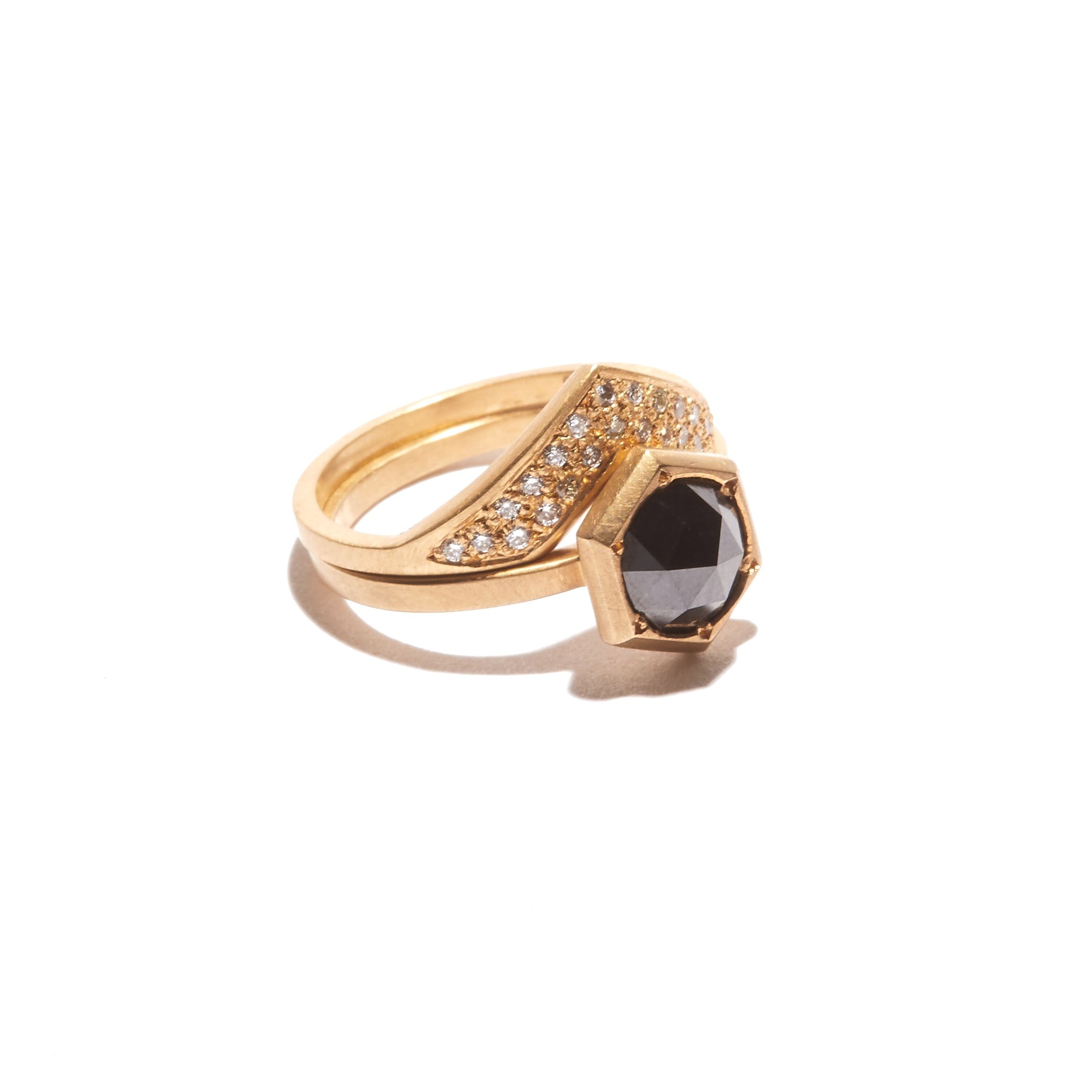 Yellow gold hexagon solitaire ring featuring a stunning rose cut black diamond. Pictured with Wide Angle Diamond Ring and Angle Diamond Ring. Rings sold separately. Choose from 9ct or 18ct yellow gold.