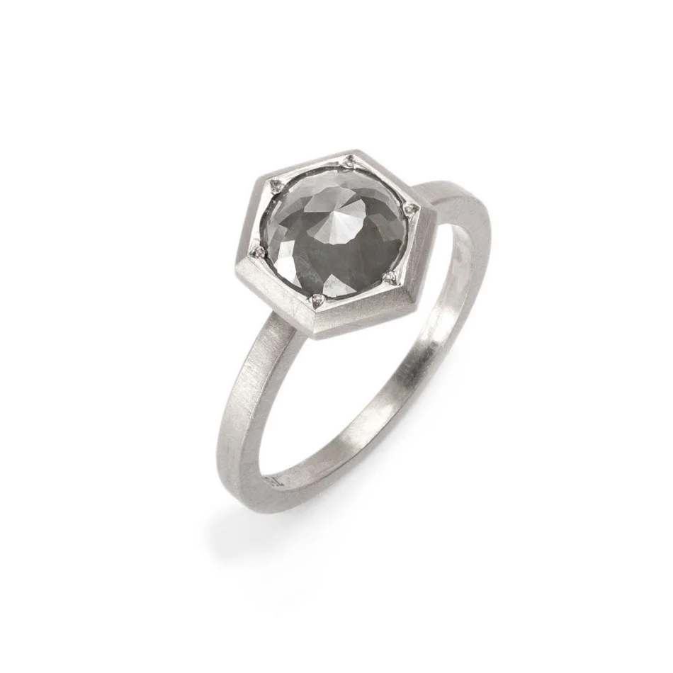 18ct white gold hexagon solitaire ring featuring a stunning one of a kind rose cut deep grey diamond. Pictured with two Angle Diamond Rings and Wide Angle Diamond Ring (sold separately).
