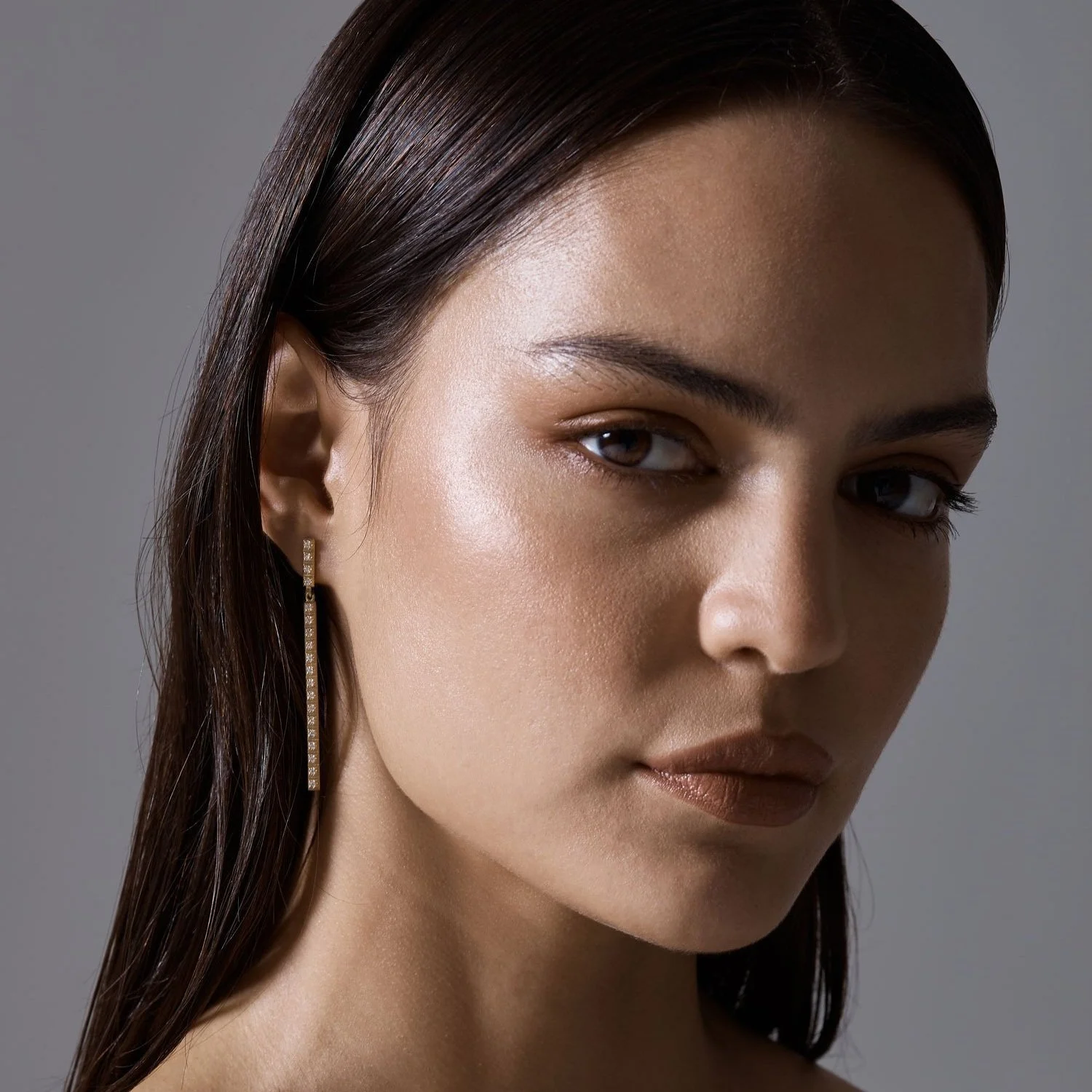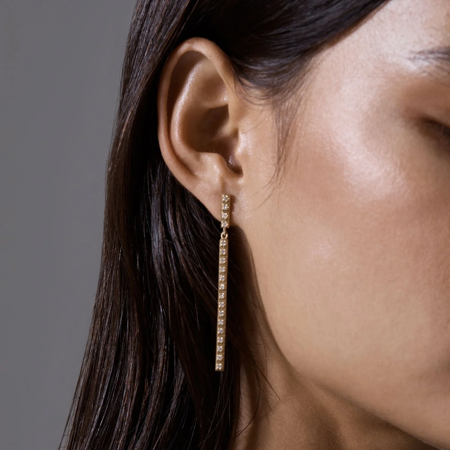 Elegant 18ct yellow gold drops studded with thirty-eight brilliant cut diamonds. Each raised setting is finished with a cross-cut four-grain technique, a signature detail honouring traditional hand-setting methods. Post and butterfly backs.