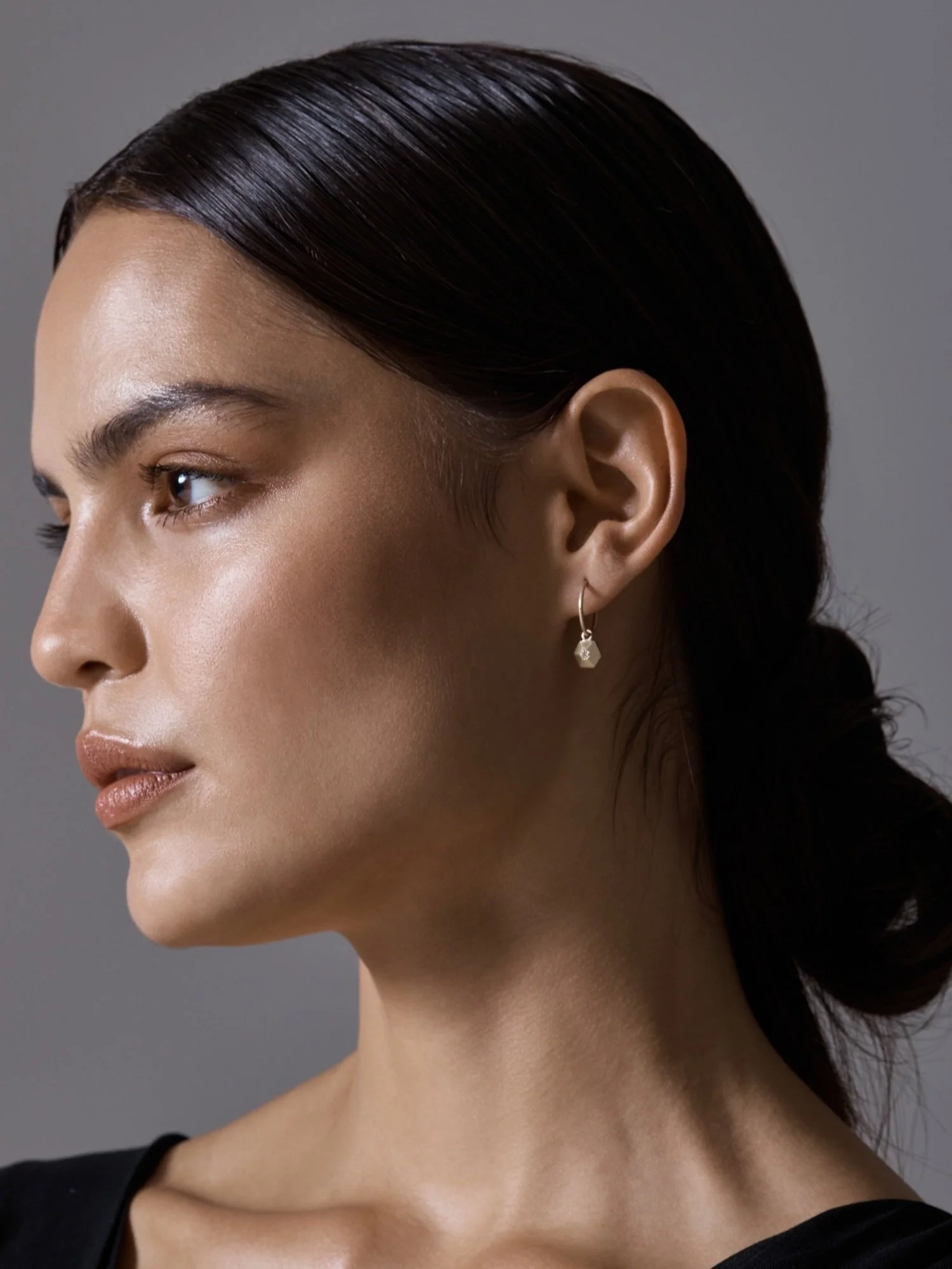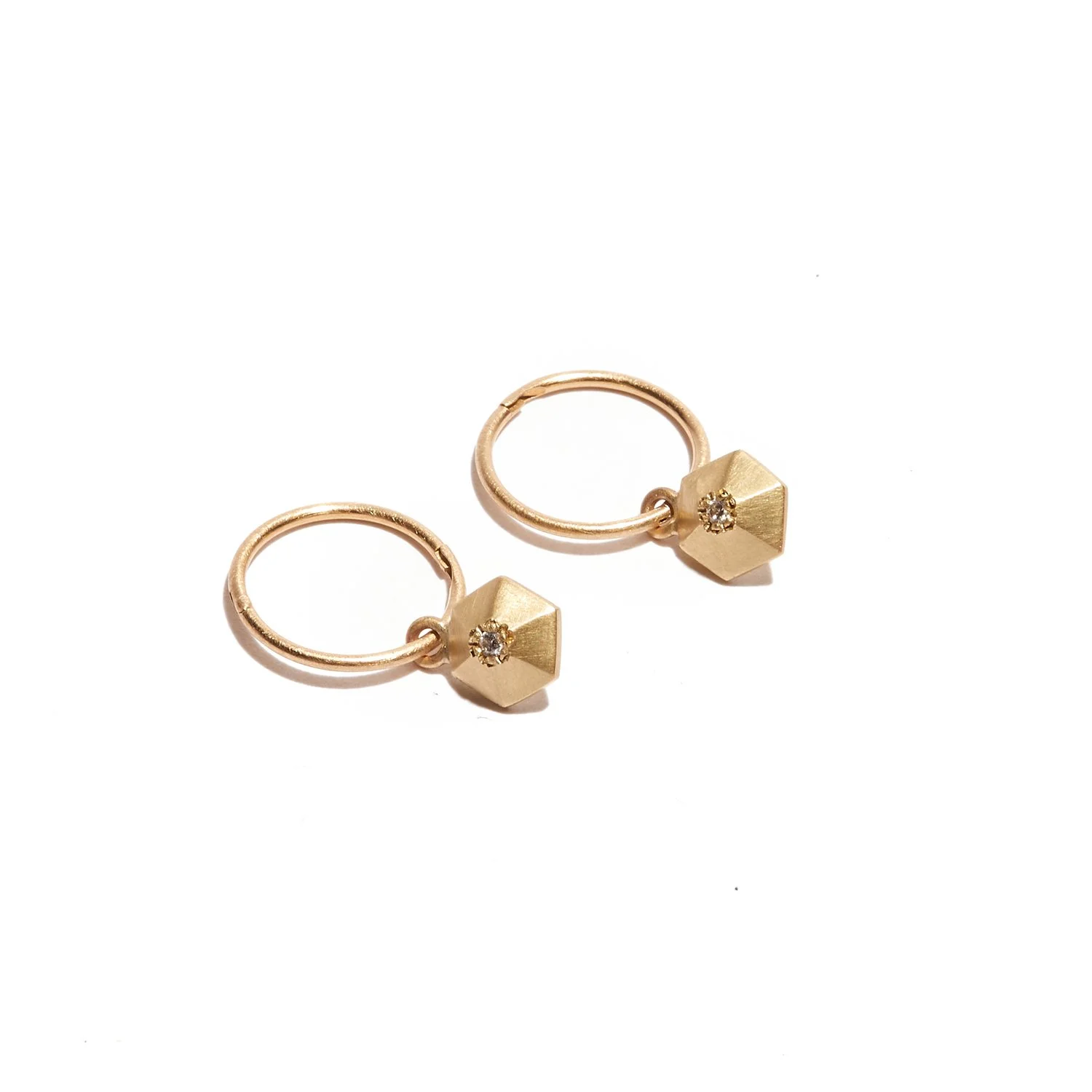 An effortless, wearable diamond earring alternative—so comfortable you can even sleep in them. Each hexagon charm features a natural white diamond, set in a cross-cut, grain technique for a refined, timeless look. Hinged solid gold sleeper hoops.