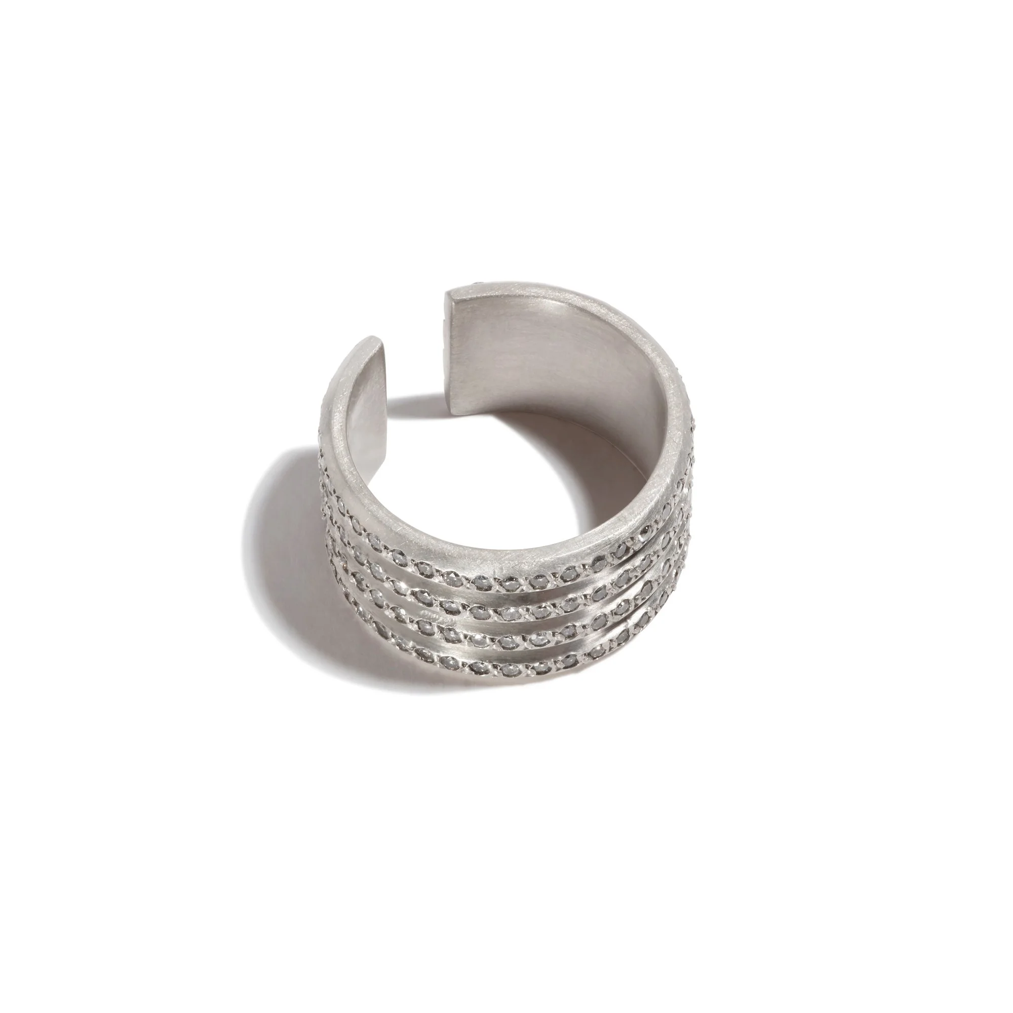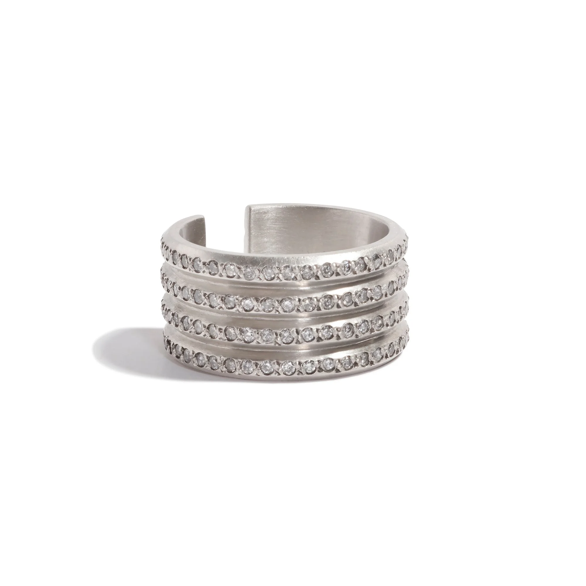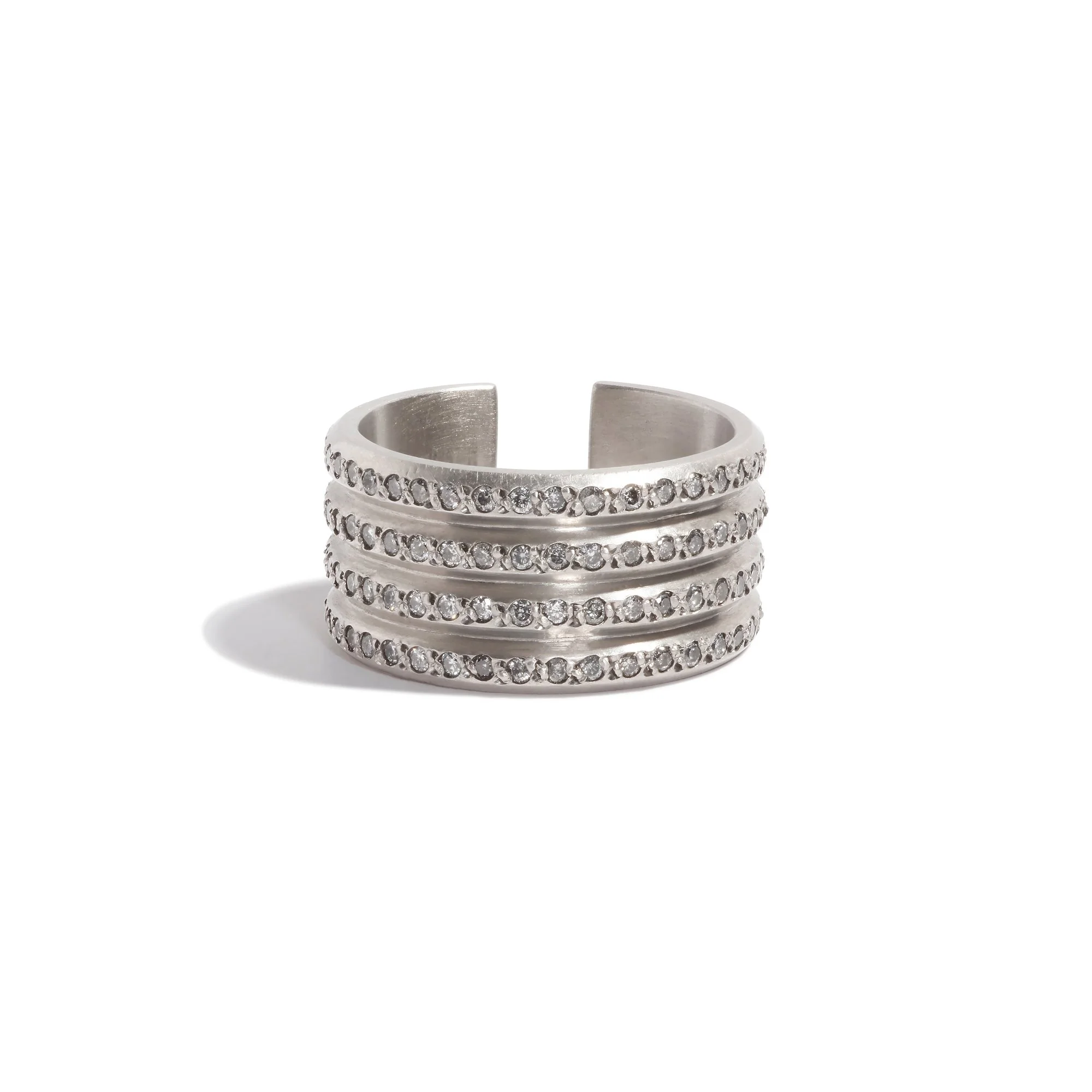 A wide platinum cuff ring with a clean, sculptural form. Four raised rows pavé-set with grey diamonds, intersected by a precise vertical cut-out. Designed to be worn with the opening at the front or reversed for a more subtle look.
