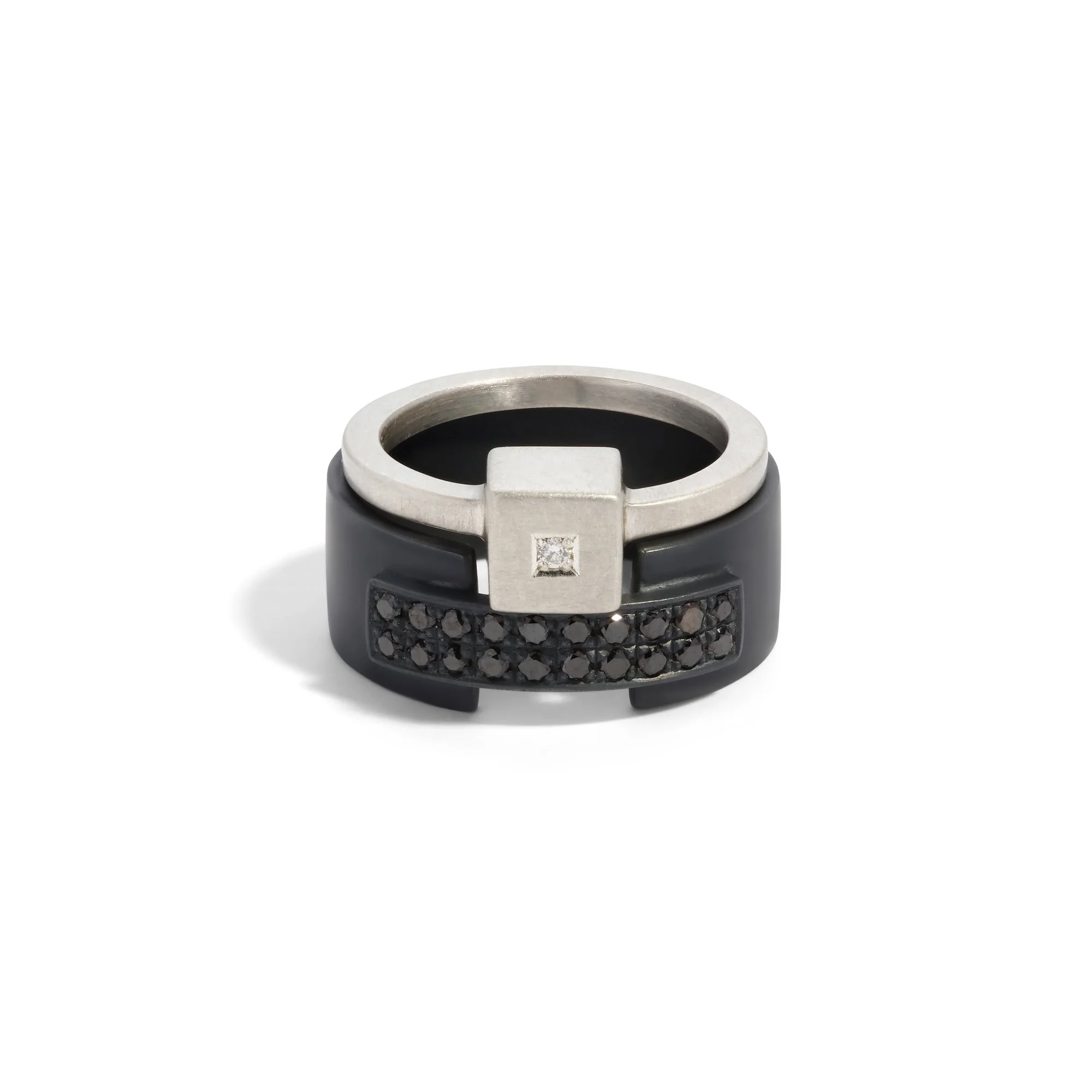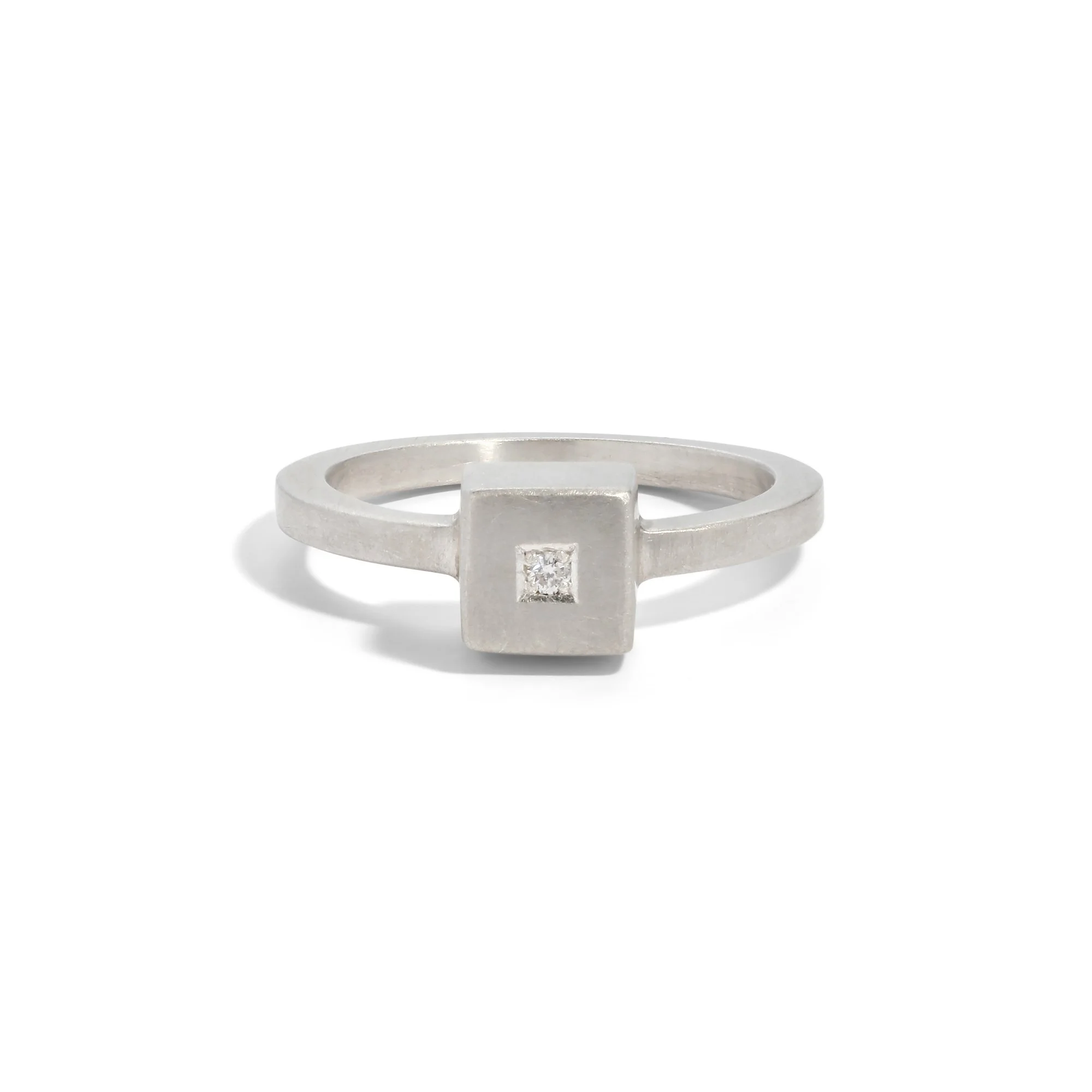 Sterling silver Cube Diamond Ring. A single cube grain set with a brilliant cut diamond. Pictured with Bridge Black Diamond Ring & Hexagon White Sapphire Ring (rings sold separately).
